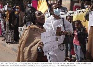 Des femmes scandent des slogans pour protester contre les violences faites aux femmes devant le bureau des droits de l’homme des Nations unies à Khartoum, au Soudan, le 2 février 2022.Si la violence sexuelle existe dans les deux camps, elle insiste sur le fait que celle-ci est « systématique » chez les paramilitaires des Forces de soutien rapide, qui l’utilisent « comme arme de guerre » à des fins de « nettoyage ethnique ». « Il s’agit d’humilier les gens, de les forcer à quitter leurs maisons », précise-t-elle.