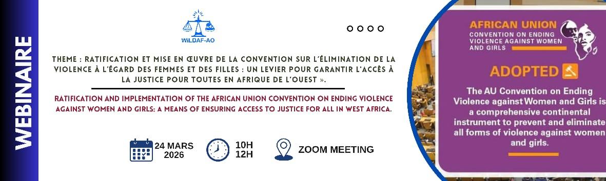 Le Réseau Women in Law and Development in Africa – Afrique de l’Ouest organise, le mardi 24 mars 2026, un webinaire intitulé : « Ratification et mise en œuvre de la Convention sur l’élimination de la violence à l’égard des femmes et des filles : un levier pour garantir l’accès à la justice pour toutes en Afrique de l’Ouest ».